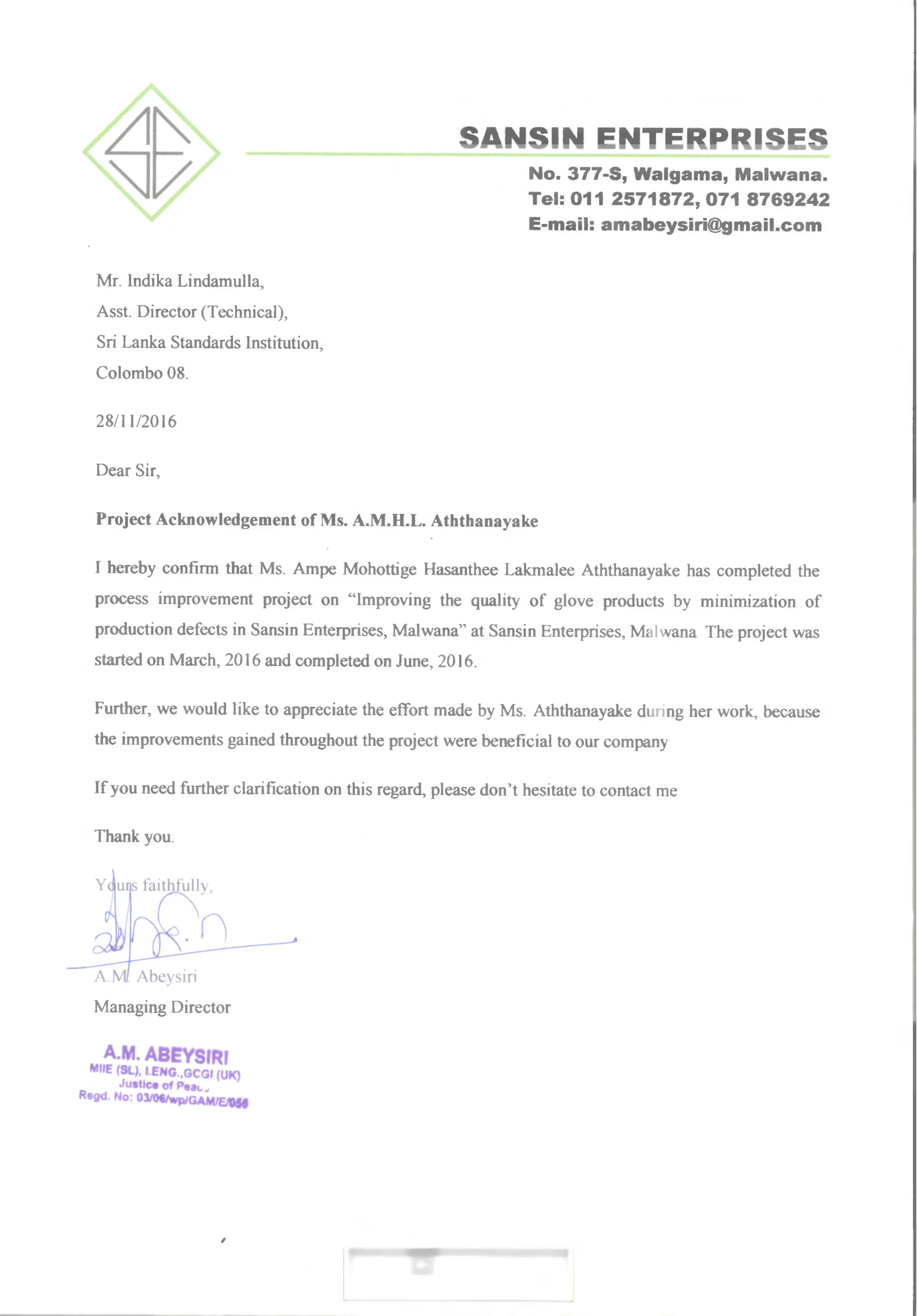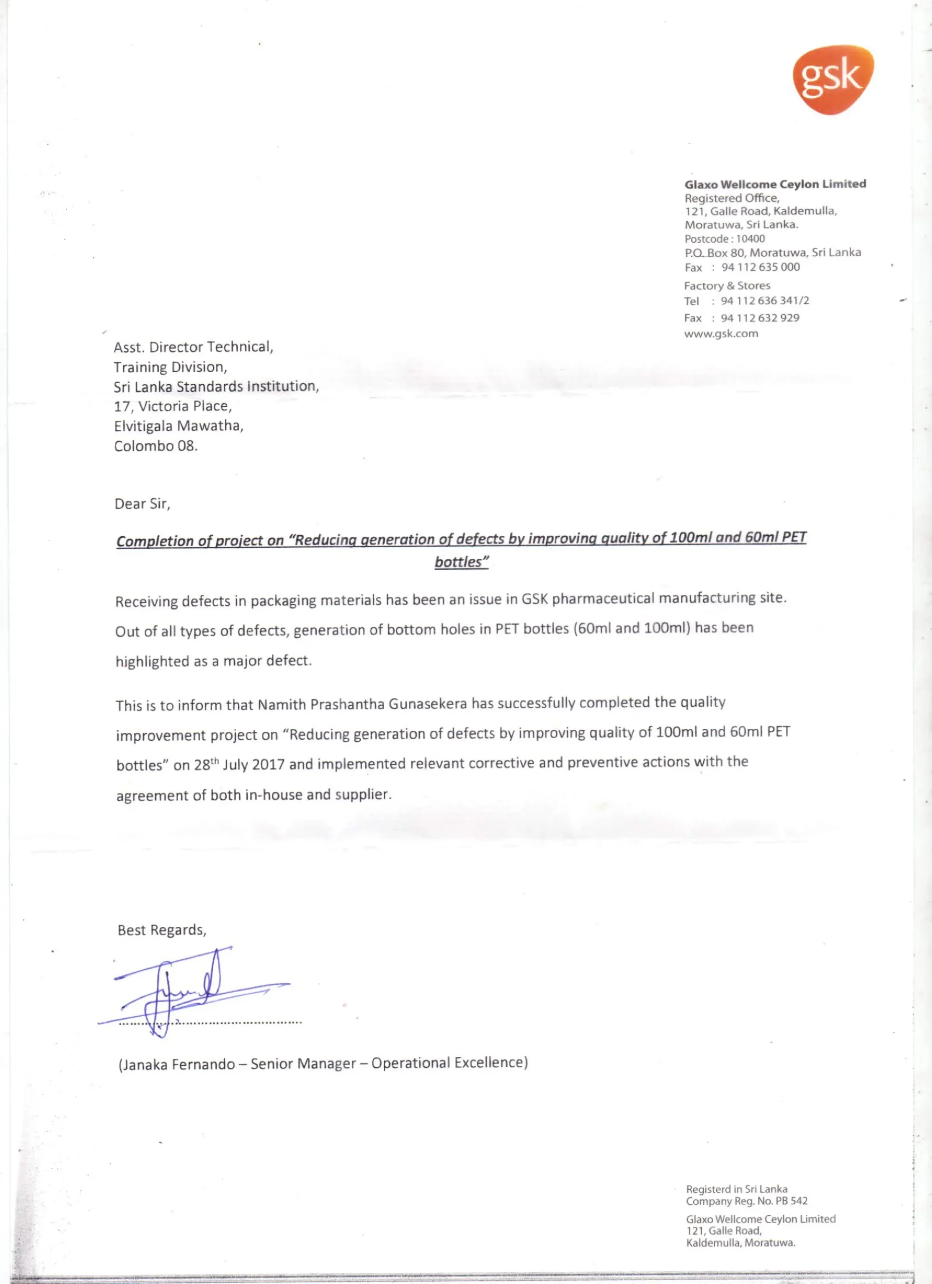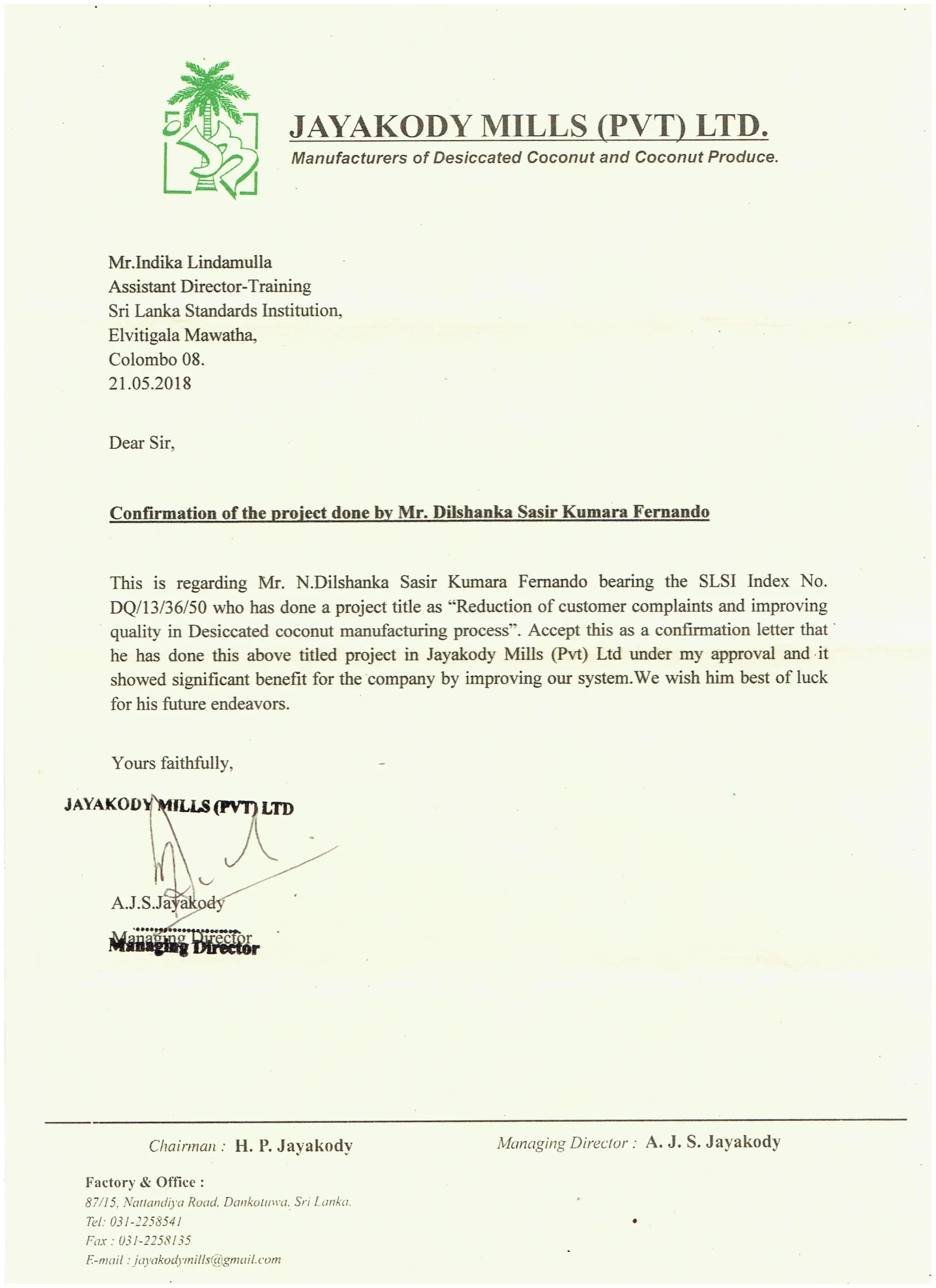 Over the past decade, I have supervised numerous industry-based Diploma in Quality Management projects across diverse sectors including manufacturing, food processing, pharmaceuticals, hospitality, plantations, public sector services, and export industries. These projects have focused on practical quality improvement, productivity enhancement, cost reduction, defect minimization, and service excellence, enabling organizations to translate quality management principles into measurable operational results. Through this supervision role, I have contributed to strengthening Sri Lanka’s national quality infrastructure by mentoring professionals, promoting evidence-based problem solving, and fostering a culture of continuous improvement within organizations. This sustained engagement reflects my commitment to bridging academic learning with industry applicatin while supporting the development of competent quality practitioners who contribute to organizational competitiveness and national development.